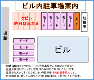 また、夜19時以降と毎週月曜日はビル敷地内にある『モード』と書かれた駐車場もご利用頂けます。